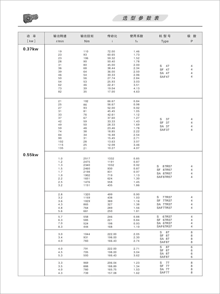 S系列斜齒輪蝸桿減速機選型參數表0.55KW