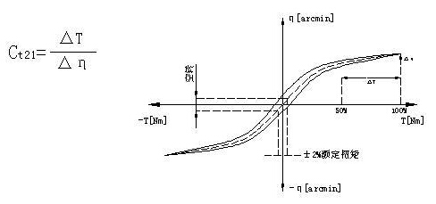 扭轉(zhuǎn)剛度Ct21[Nm/Arcmin]:由加載力矩和所產(chǎn)生的扭轉(zhuǎn)角之間的比率來(lái)定義。Ct21=△T/△ψ。它說(shuō)明需要用多大的力矩才能把輸出軸轉(zhuǎn)動(dòng)一弧分。扭轉(zhuǎn)剛度是從遲滯曲線(xiàn)得出的。在曲線(xiàn)圖上只需要關(guān)注T2B的50%和100%這個(gè)范圍,在這個(gè)范圍內(nèi),曲線(xiàn)可看成是一條直線(xiàn)。