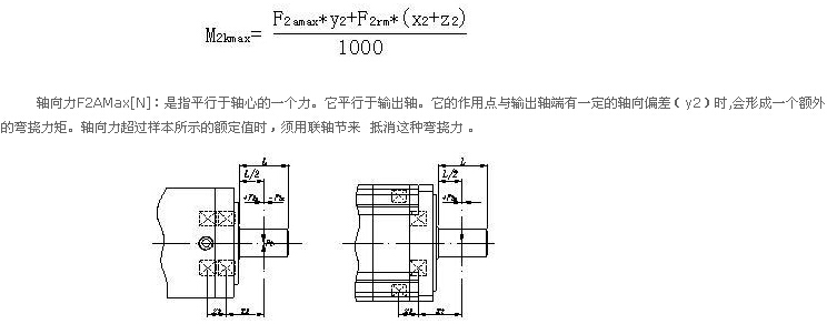 側(cè)傾力矩[Nm]:指軸向力和徑向力作用于輸出端軸承上徑向受力點(diǎn)的力矩。其計(jì)算公式為: